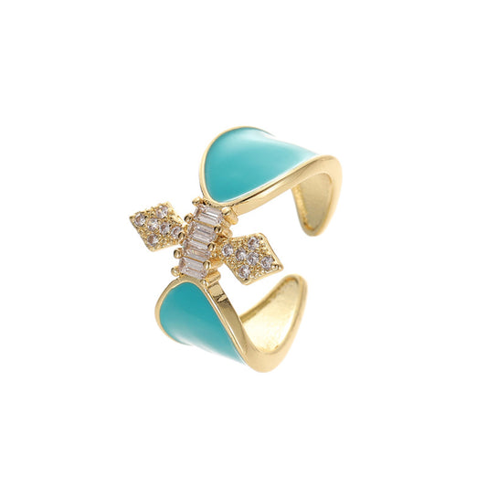 2 Open Circle Iris Statement Ring Enamel Epoxy Rhinestone Embellished 14K GF