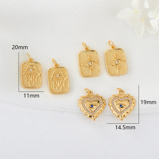 2 Rectangle Heart Hamsa Evil Eye Charm Pendant Rhinestone Embellished 14K GF