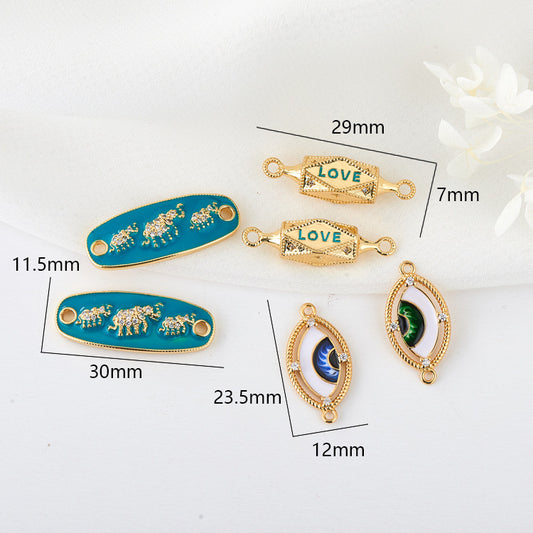 2 Double Looped Love Oval Eye Elephant Charm Connector Enamel Epoxy Rhinestone Embellished 14K GF