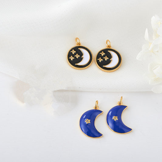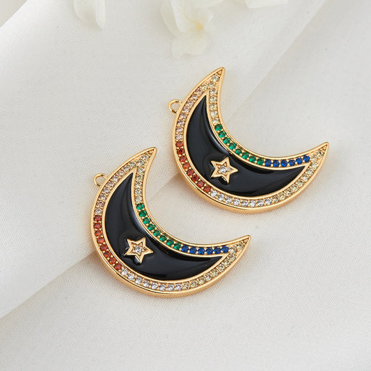 2 Moon Star Charm Pendant Enamel Epoxy 14K GF Rhinestone Embellished