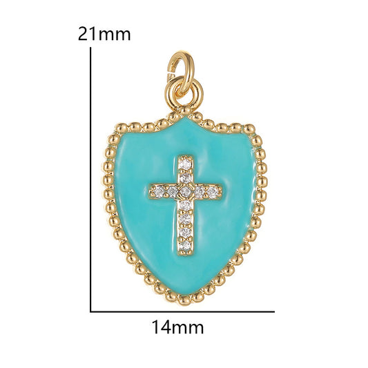 2 Cross Shield Charm Pendant Enamel Epoxy 14K GF Rhinestone Embellished