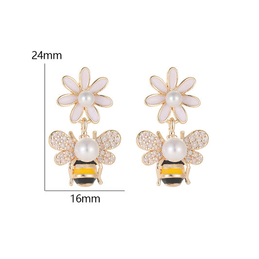 4 Bee Charm Daisy Floral Stud Earrings Enamel Epoxy 14K GF Rhinestone Embellished Earing