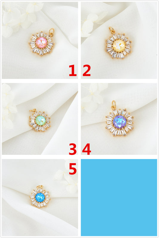 2 Round Floral Charm Pendant Rhinestone Embellished 14K GF