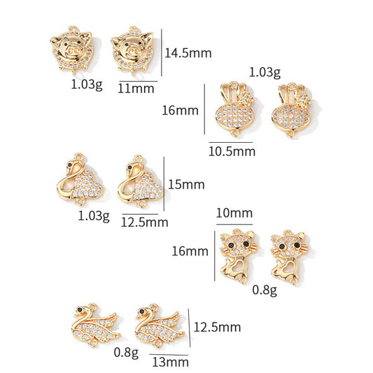 2 Double Looped Swan Cat Rabbit Pig Charm Connector Rhinestone Embellished 14K GF