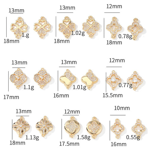 2 Double Looped Floral Four Leaf Clover Charm Connector Rhinestone Embellished 14K GF