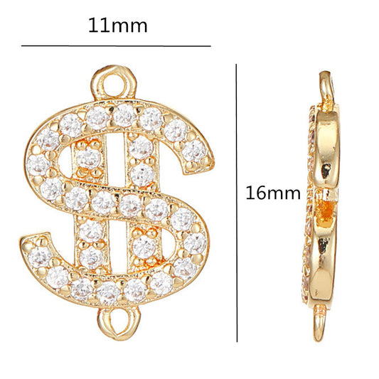 2 Double Looped Money Sign Charm Connector Rhinestone Embellished 14K GF
