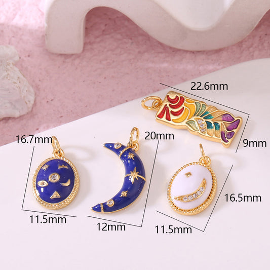 2 Moon Rainbow Oval Charm Pendant Enamel Epoxy 14K GF Rhinestone Embellished