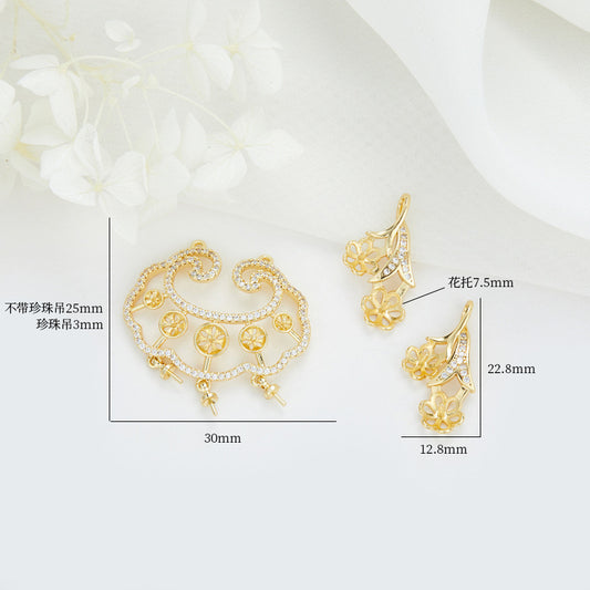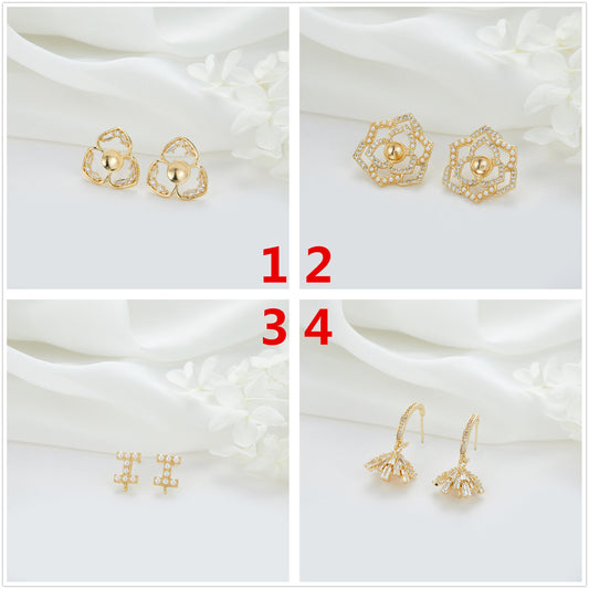 4 Floral Stud Earrings Rhinestone Embellished 14K GF Earing Half Drilled Pearl Bead Blank