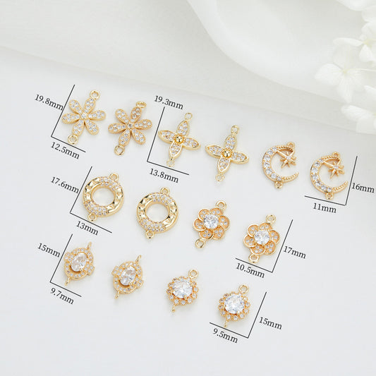 2 Double Looped Floral Circle Moon Oval Charm Connector Rhinestone Embellished 14K GF