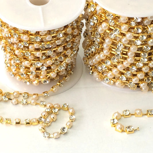 10 YDs Rhinestone+Pearl Cup Chain Silver / Gold Trim Metal Cup Close Chain Jewelry Finding 2mm