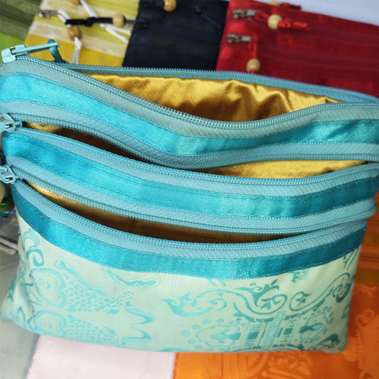 3x7" Colorful Chinese Sea Wave Silk Rosary Bag Pouch Money Coin Wallet with Three Zips Grab Bag Traditional Jewelry Gift Packaging