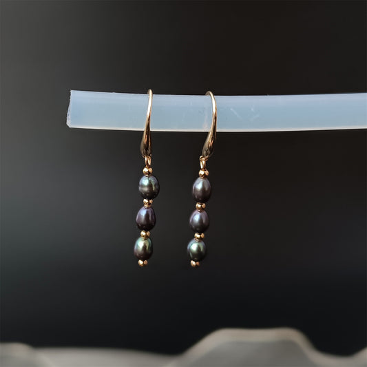 Natural Freshwater Three Black Pearls Hook Earrings Daily Wear 14K GF Plain Ear Hooks Dangle Earing
