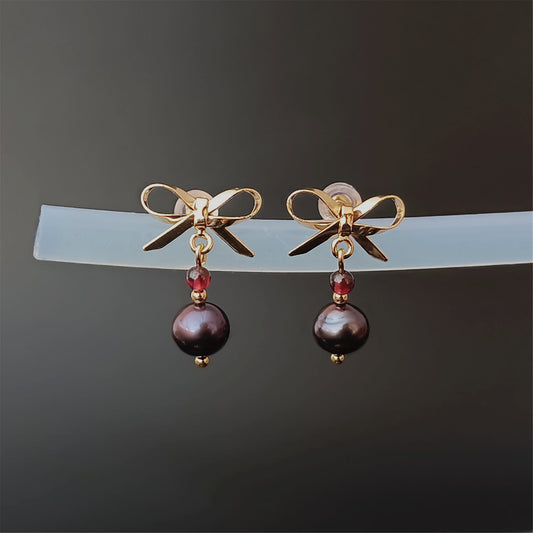 Natural Freshwater Black Pearl Earrings Daily Wear 14K GF Bowknot Ear Stud Dangle Earing