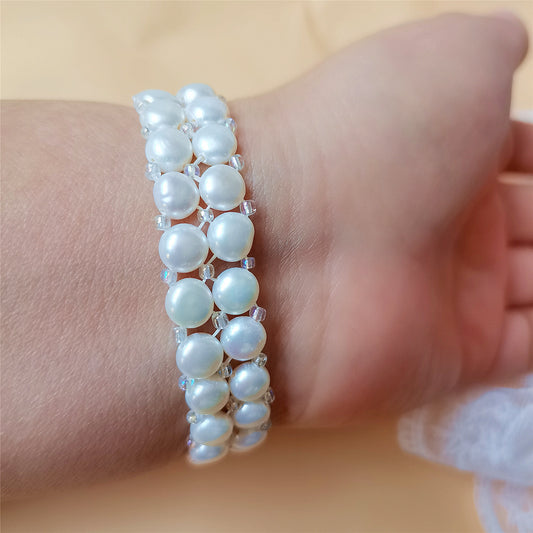 7MM White Freshwter Pearl Two Rows Bracelet 7" Natural Bead Elastic Braid Bangle