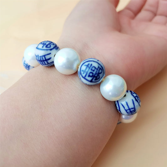 14MM White Shell Pearl Ceramics Bracelet 7" South Sea Beaded Elastic Bangle