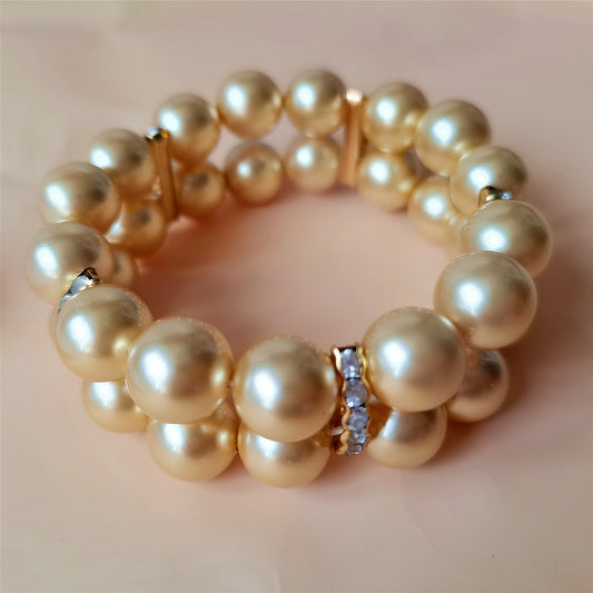12MM Golden Shell Pearl Two Rows Bracelet 7" South Sea Beaded Elastic Bangle