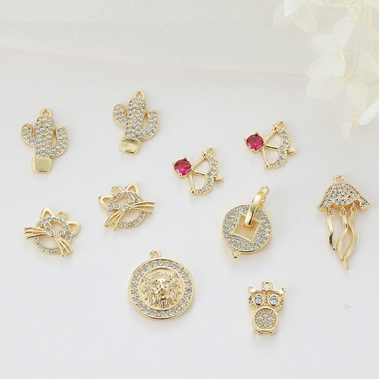 2 Pfeil-Katze-Kaktus-Quallen-Eulen-Löwe-Münzen-Charm-Anhänger mit Strasssteinen verziert, 14K GF