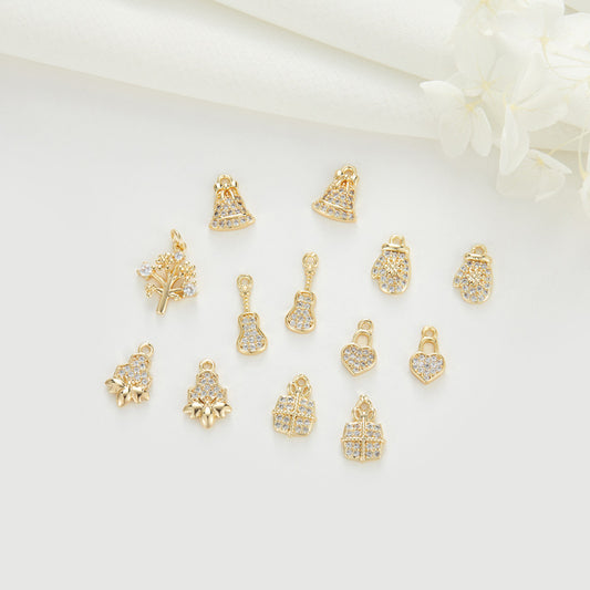 2 Gitarren-Herz-Schloss-Handschuh-Glocken-Blatt-Baum-Charm-Anhänger mit Strasssteinen verziert 14K GF