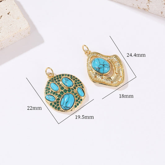 2 unregelmäßig geformte ovale Charm-Anhänger aus türkisfarbenem Harz mit Strasssteinen, verziert mit 14-karätigem GF