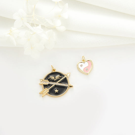2 Pfeil-Herz-Charm-Anhänger, Emaille, Epoxidharz, 14 K GF, Strass verziert