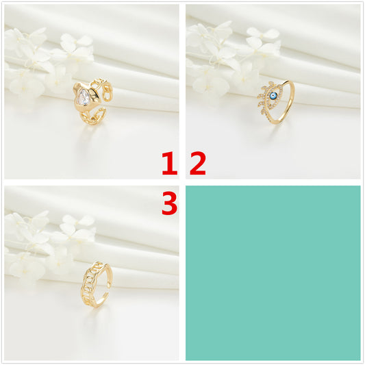2 Statement-Ringe mit offenem Kreis und bösem Blick, Herz-Kabelkette, Strassverzierung aus 14-karätigem GF