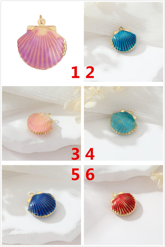 2 Muschel-Foto-Medaillon-Charm-Anhänger, Emaille, Epoxidharz, 14 K GF