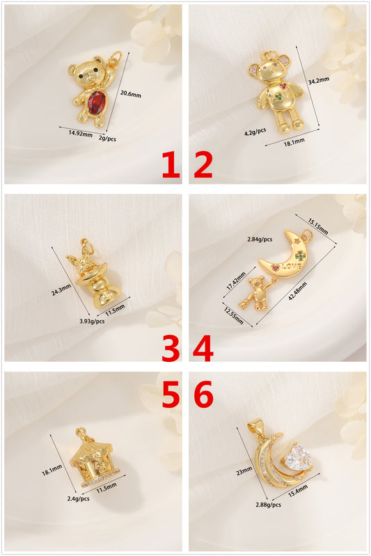 2 kleine Bären-Kaninchen-Mond-Charm-Anhänger mit Strasssteinen, 14 Karat GF