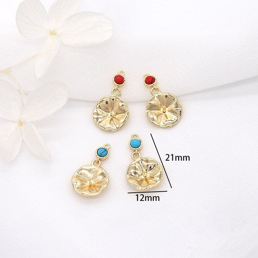 2 runde Charm-Anhänger, türkis, verziert, 14 Karat GF, halbgebohrte Perle, Rohling