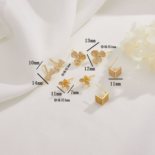 4 Ohrstecker mit Blumen-Schleife, kubische Biene, mit Strasssteinen verziert, 14-Karat-GF-Ohrring, halbgebohrte Perle, Rohling
