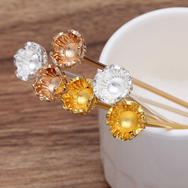 20 florale chinesische Stab-Haarnadeln, 18 kgp, 12 mm, rund, nicht poröse Perlen, blanko Basis, Edelstein-Perlenfassung