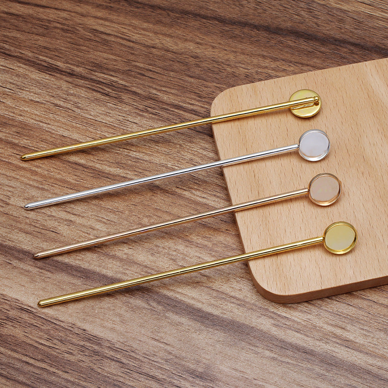 10 Plain Edge Bezel Cup Chinese Stick Hairpin 18KGP 12mm Round Cabochon Blank Base Gemstone Piece Setting