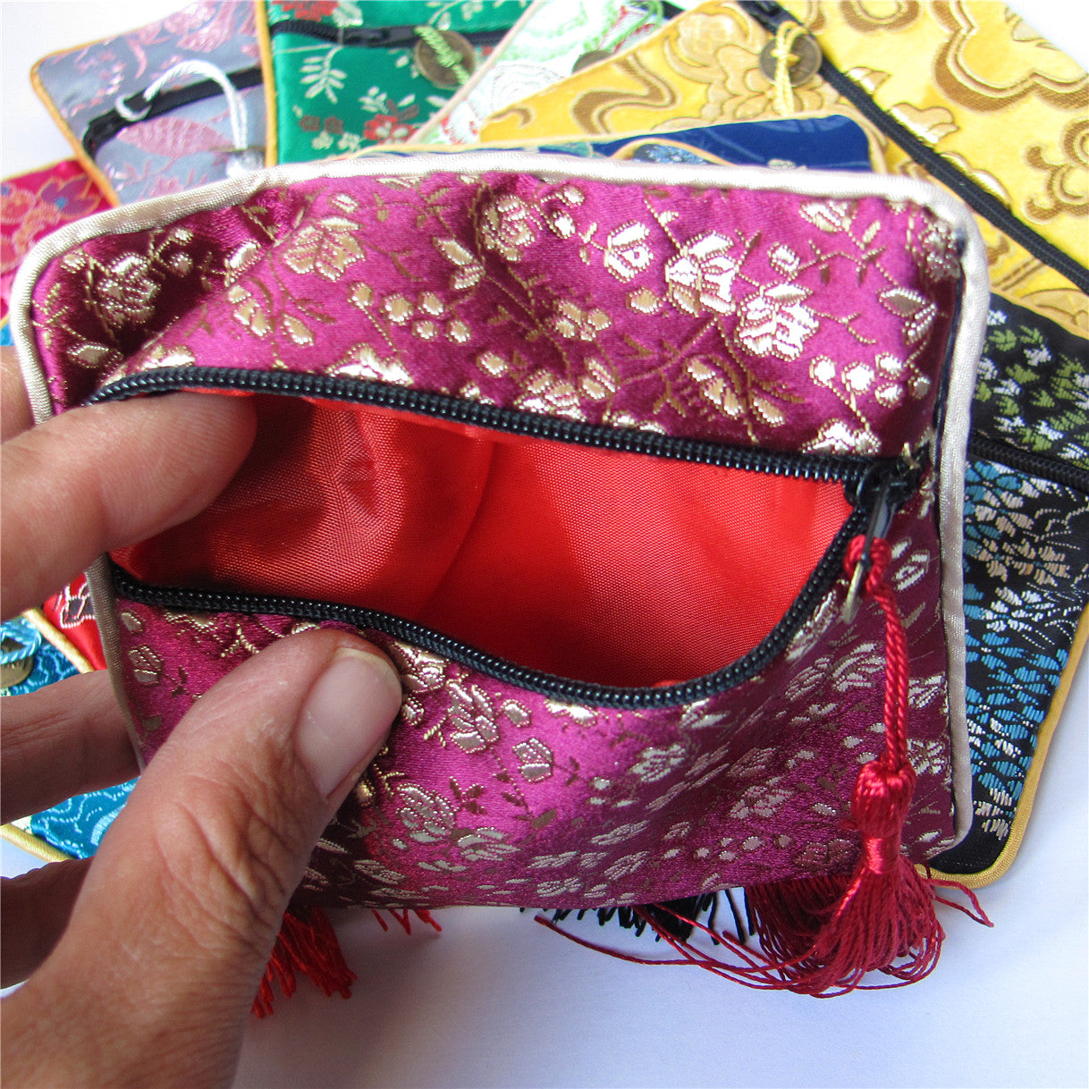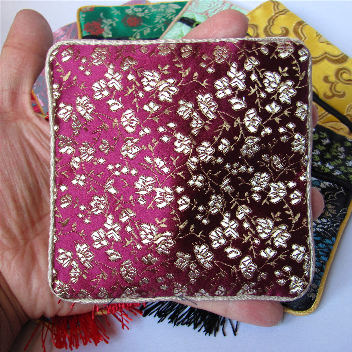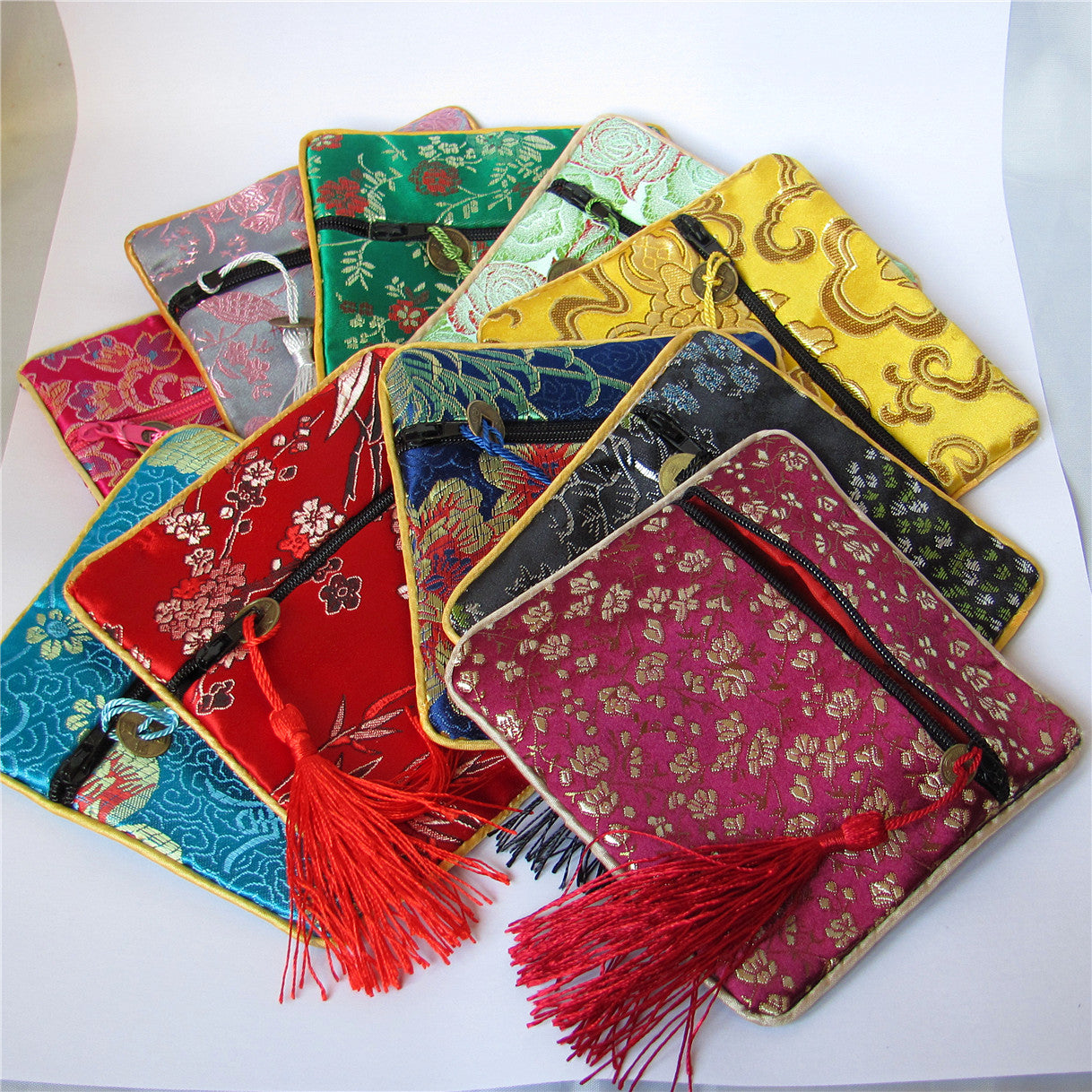 11,4 x 11,4 cm bunte chinesische Seidenbeutel, Taschengeld-Münzenbeutel mit Reißverschluss, viele traditionelle Verpackungsbeutel für Schmuck, Geschenke