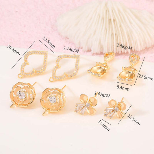 4 boucles d'oreilles florales à tige ornées de strass 14 carats GF, perles semi-percées vierges
