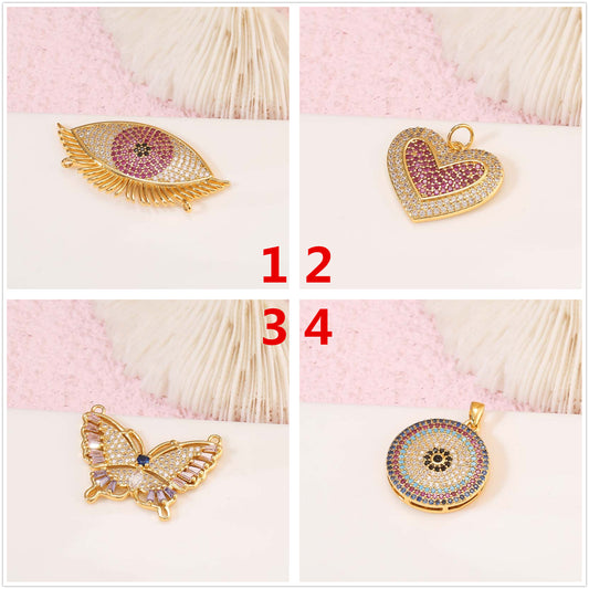 Pendentif à breloque rond à 2 yeux, cœur et papillon, orné de strass, 14K GF