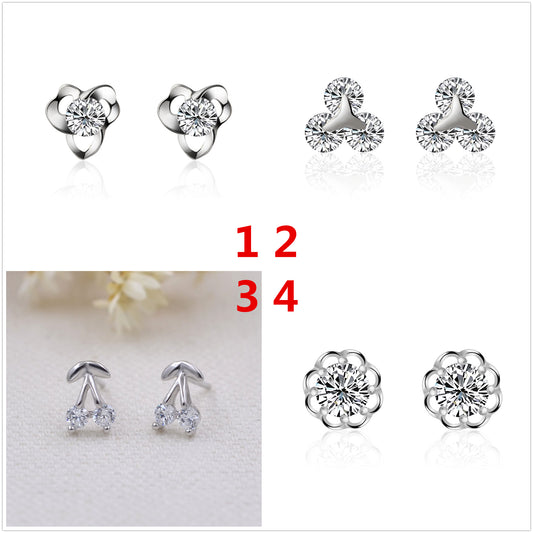 Sterling Silver Rhinestone Embellished Triangle Cherry Floral Waterdrop Wave Crown Stud Earrings S925 Finding