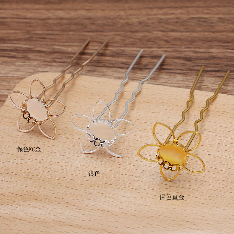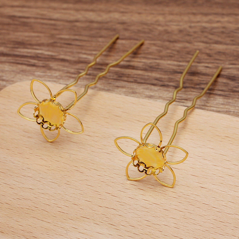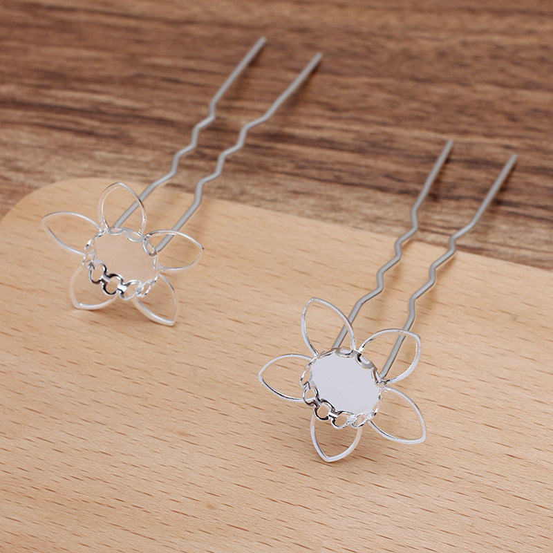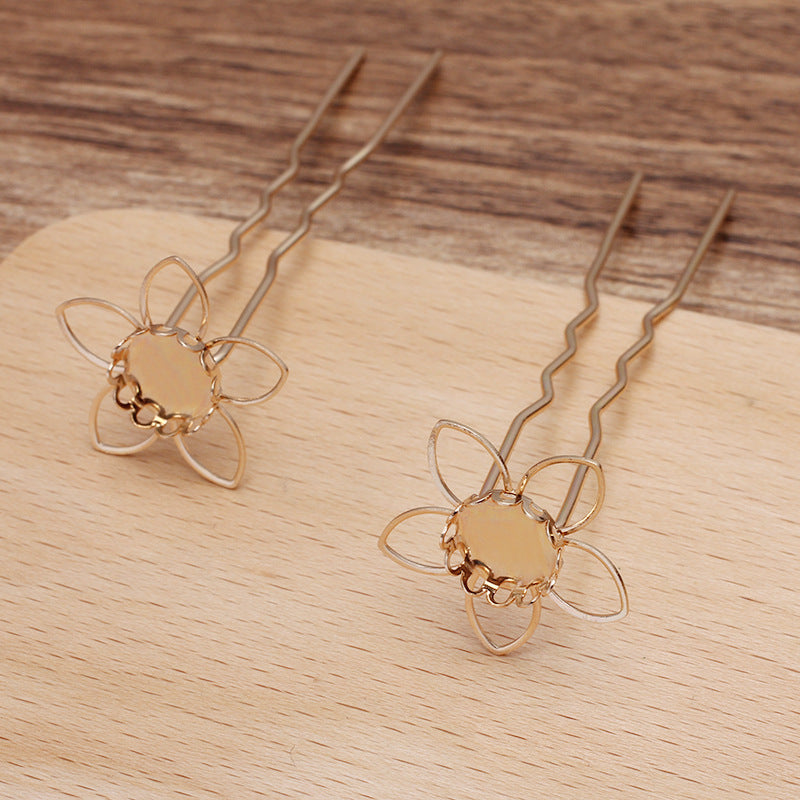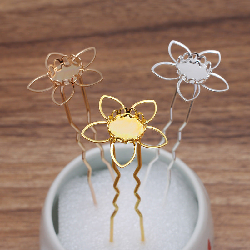10 Scallop Edge Bezel Cup Filigree Floral Charm Hair Fork Hairpin 18KGP 10mm Round Cabochon Blank Base Gemstone Piece Setting