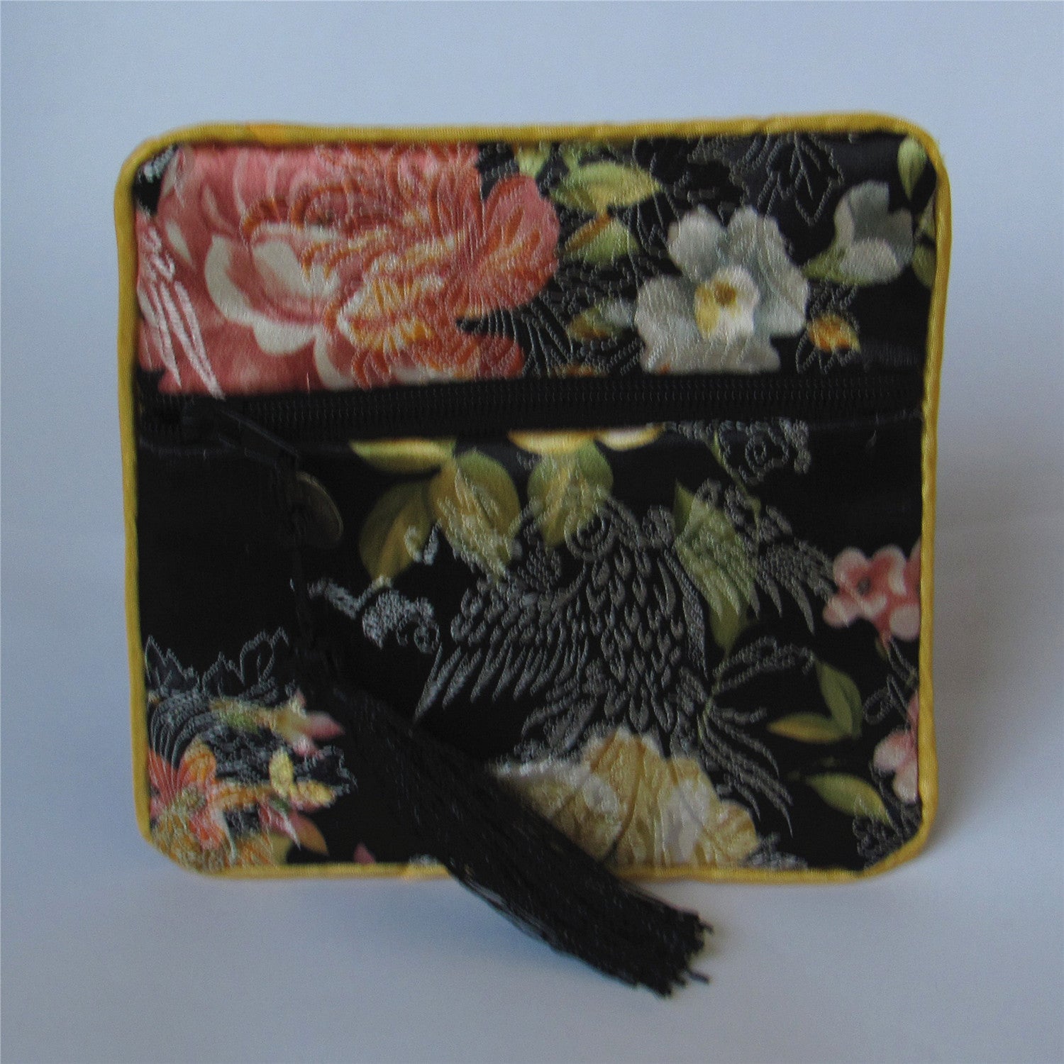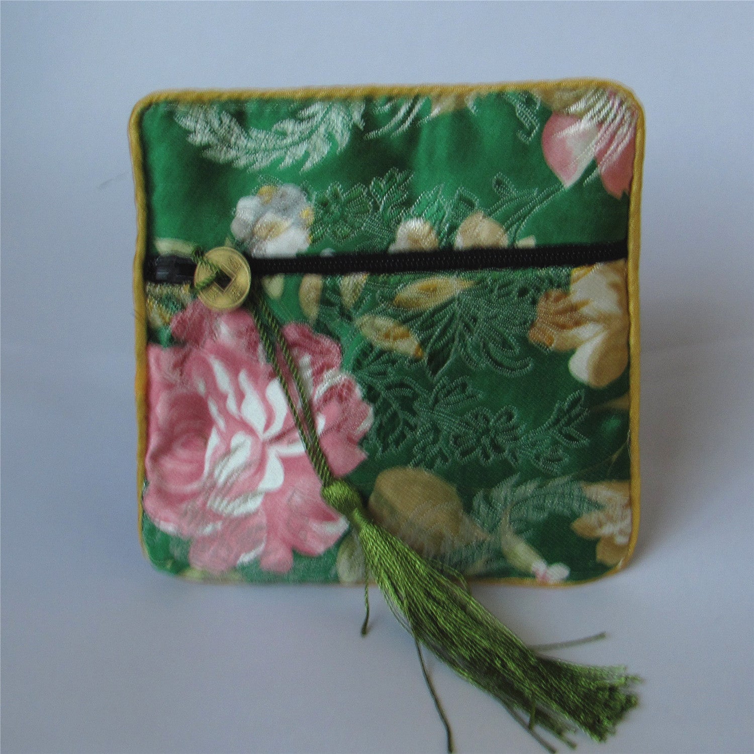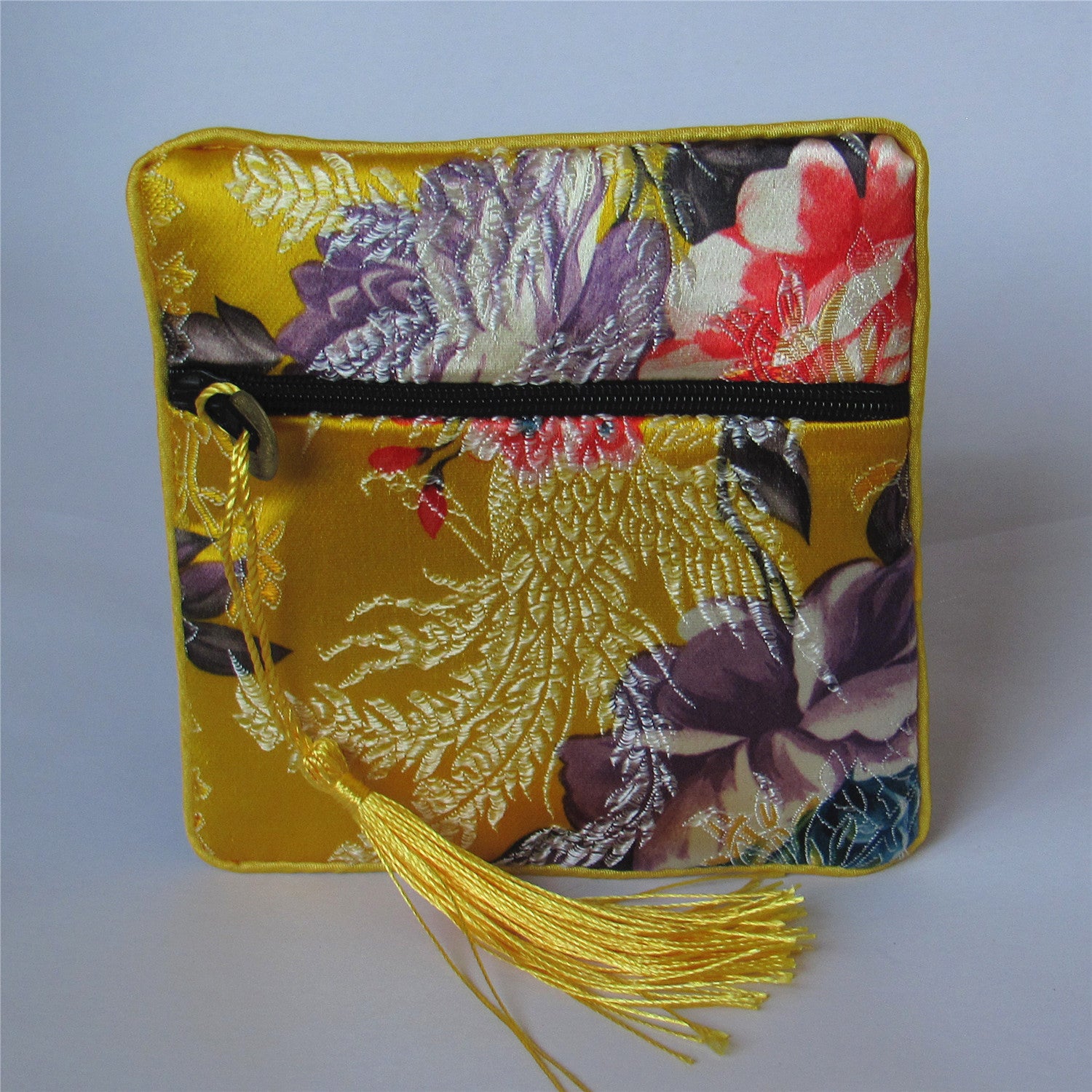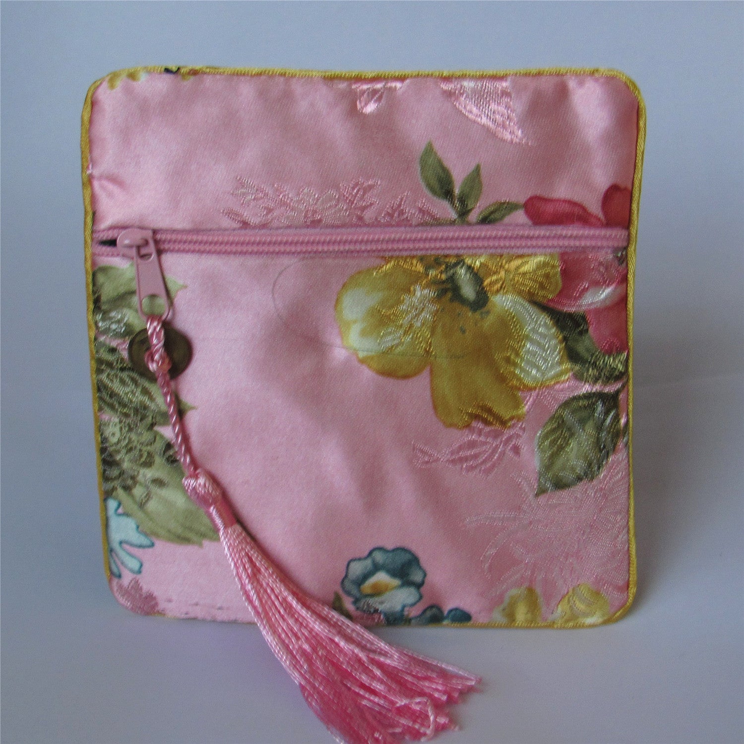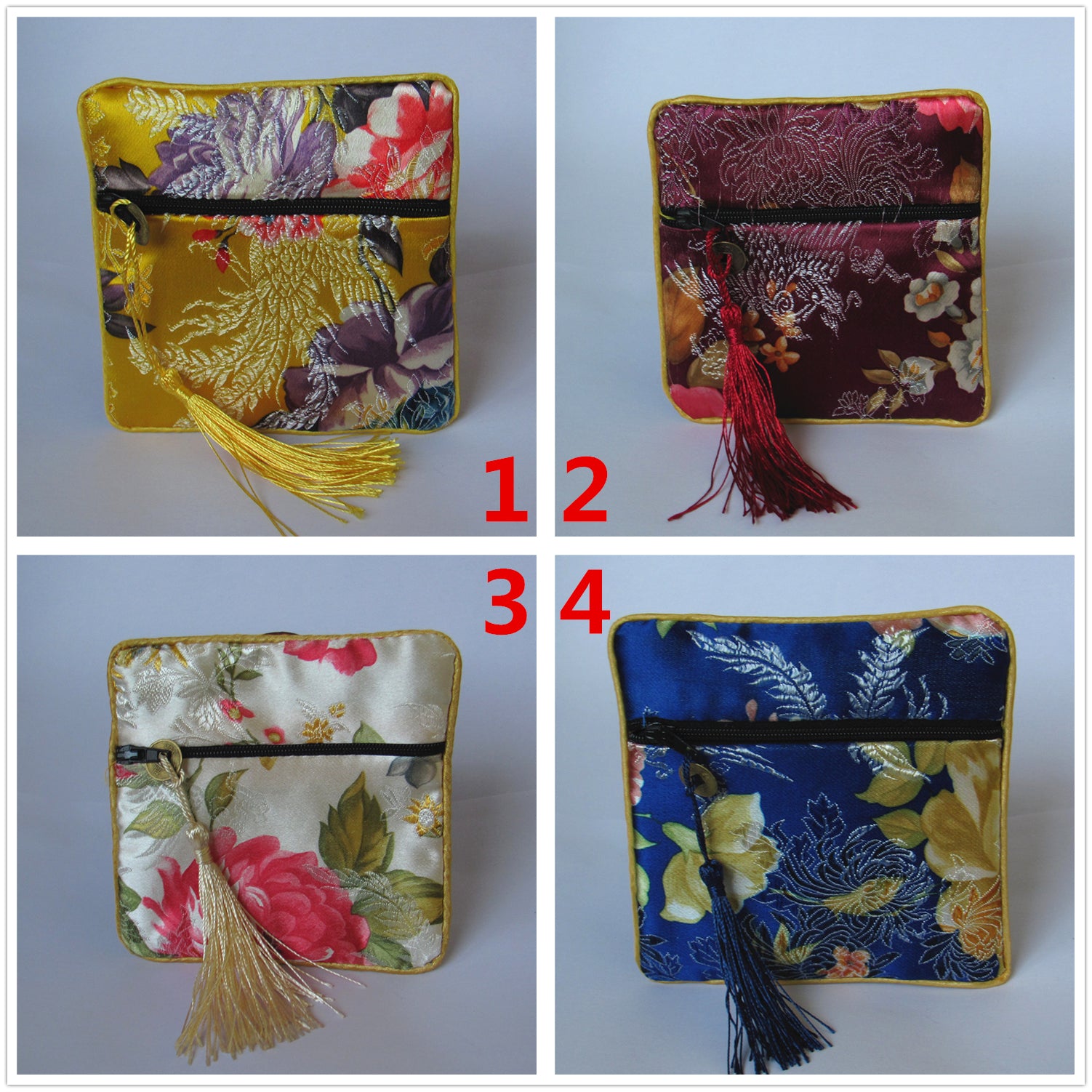 4x4" Colorful Floral Chinese Silk Pouch Pocket Money Coin Bag with Zip Grab Bag Rosary Bead Traditional Packaging Bags for Jewelry Gift